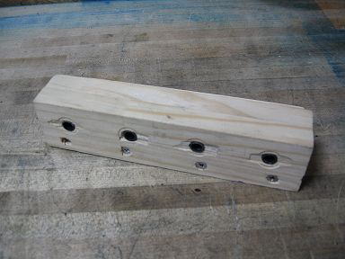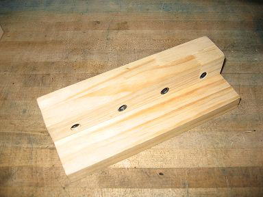 ジグは端材で製作、したがってパイン集成材製。板を2枚貼りあわせて厚みを稼ぎ、φ10mmの穴を開ける。
