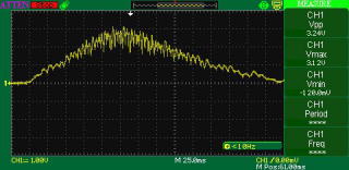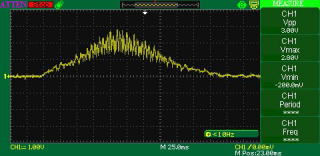 +,−出力に抵抗負荷つないで(コンデンサは無し)、接地出力からみた+出力の電圧を観測してみました。(片側は開放。)